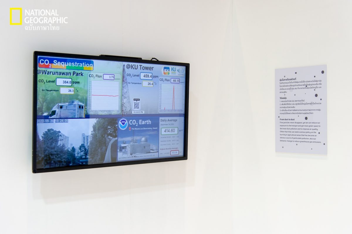 นอกจากเรื่องของฝุ่นแล้ว ภายในนิทรรศการจะมีจอแสดงการวัดปริมาณก๊าซคาร์บอนไดออกไซด์ เปรียบเทียบระหว่างพื้นที่ในเมืองที่มีพื้นที่สีเขียว หรือมีต้นไม้อย่างหนาแน่น (ในภาพคือสถานีตรวจวัดที่มหาวิทยาลัยเกษตรศาสตร์) กับพื้นที่ในเมืองที่มีความหนาแน่นในพื้นที่สีเขียวน้อยกว่า ซึ่งวัดกันแบบ Real time นาทีต่อนาที เปรียบเทียบกับสถานีตรวจวัดปริมาณคาร์บอนไดออกไซด์ที่มลรัฐฮาวาย สหรัฐอเมริกา ซึ่งเป็นแหล่งอ้างอิงในระดับโลก