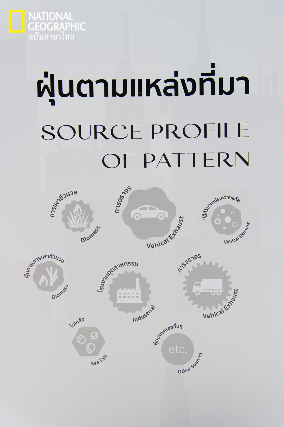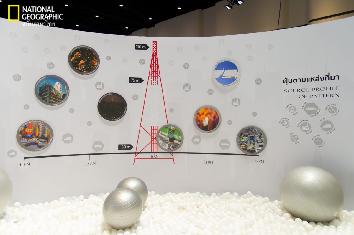ไฮไลท์ของนิทรรศการนี้คือ การนำเสนอ “ฝุ่นเมือง” ทั้ง 6 แบบ ได้แก่ 1. Midnight Particle Patterns หรือเรียกว่า “ฝุ่นหลังเที่ยงคืน” / 2. Inversion Particle Patterns หรือ “ฝุ่นอุณหภูมิผกผัน” ที่เรามักเรียกกันว่า “ฝุ่นฝาชีครอบ” / 3. Transboundary Particle Patterns หรือฝุ่นจากการเคลื่อนที่ระยะไกล / 4. Secondary Particle หรือ Photochemical Particle Patterns หรือฝุ่นทุติยภูมิ / 5. Mixed Particle Patterns ซึ่งเป็น ฝุ่นรูปแบบผสมผสาน / 6. Unpattern หรือ ฝุ่นไม่มีรูปแบบ