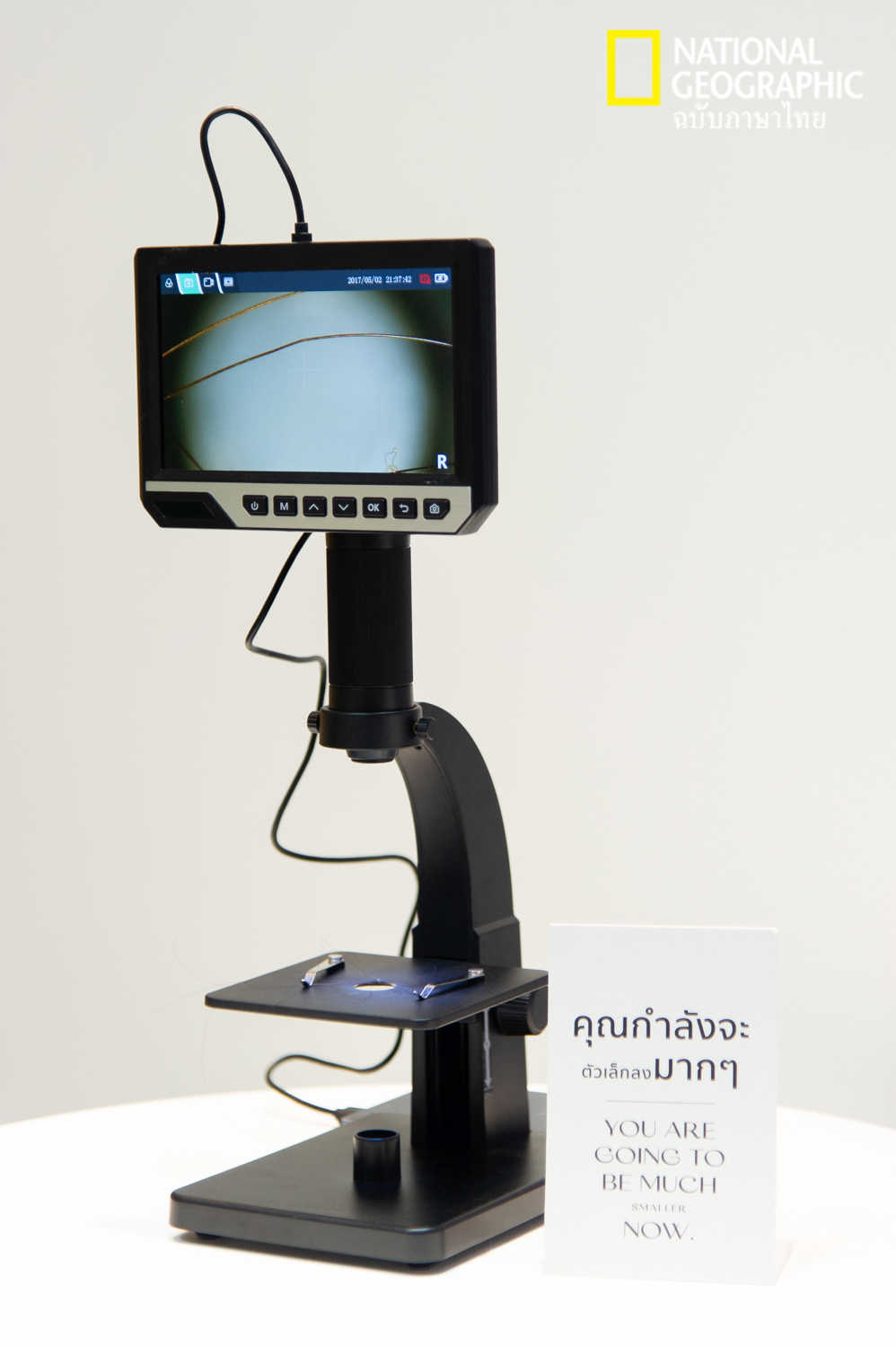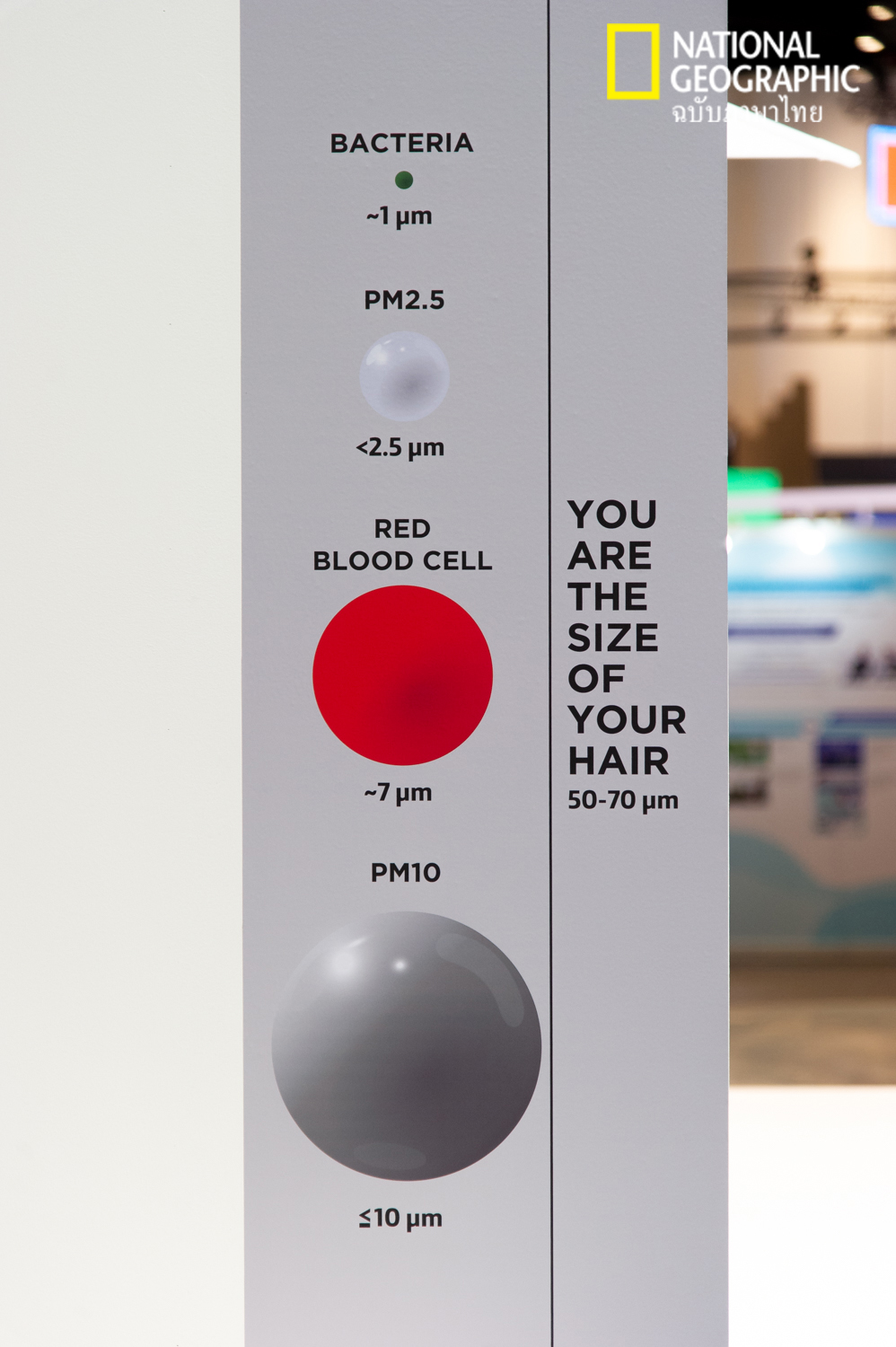 หน้าทางเข้านิทรรศการ จะมีกล้องจุลทรรศน์ที่ส่องให้เห็นถึงถึงเส้นผมเส้นเล็กๆ ซึ่งเส้นผมจะเป็นตัวเปรียบเทียบของฝุ่นขนาดต่างๆ ที่จะบอกเล่าในนิทรรศการ โดยฝุ่นที่มีขนาดใหญ่สุดอย่าง PM10 มีขนาดเล็กกว่าเส้นผม 5-7 เท่า โดยฝุ่นที่มีขนาดเล็กสุด คือ PM1 มีขนาดเทียบเท่าได้กับแบคทีเรีย