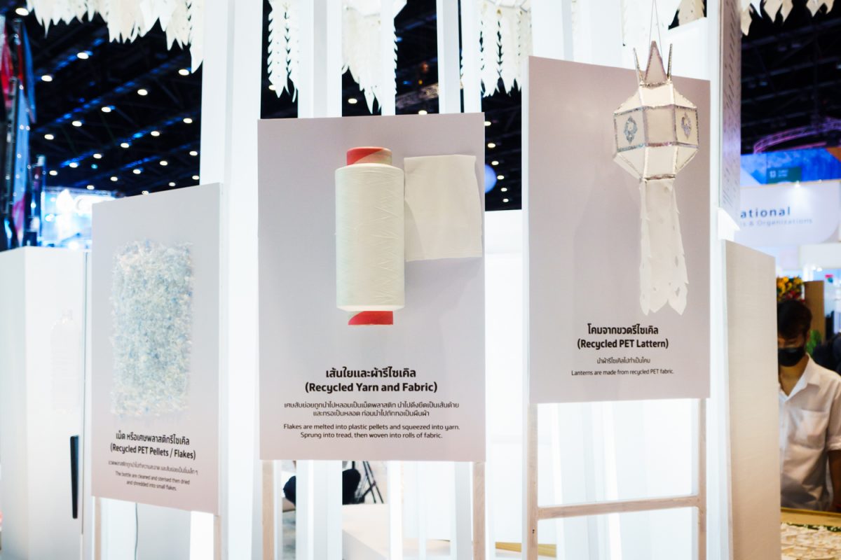 อย่างการทำโคม ขั้นแรกจะต้องเริ่มจากการคัดแยกทั้งฝาและฉลากออกจากตัวขวดก่อนจะนำไปบดให้กลายเป็นพลาสติกจิ๋วขนาดเพียง 5 มิลลิเมตร หลังจากนั้นจึงนำไปหลอมรวมกันแล้วยืดให้กลายเป็นเส้นใยพลาสติกที่สามารถนำไปถักทอเป็นผืนผ้าเพื่อใช้ในการทำโคม