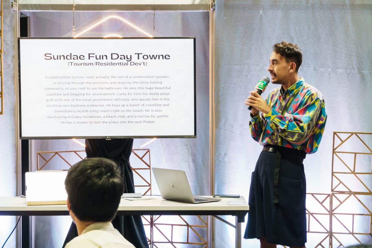 วิทยากรให้นักศึกษาออกแบบเกาะที่ตัวเองอยากเห็นอยากให้เป็น โดยโจนาธานสอนวิธีการใช้ภาพประกอบที่เข้าออกแบบมา แยกเป็นแบคกราวนด์ที่มีทั้งมหาสมุทร พื้นที่ชายฝั่ง และเกาะ พร้อมกับไอเท็มสิ่งมีชีวิต ชุมชน เรือประมงเล็กใหญ่ และสิ่งก่อสร้างต่างๆ ทั้งท่าเรือ ธุรกิจประมง ท่องเที่ยว อุตสาหกรรมขนาดใหญ่ หากนักศึกษาอยากเติมอย่างอื่นเข้าไปเองก็สามารถทำได้ โดยการออกแบบเกาะในฝันเริ่มจากธรรมชาติที่สมบูรณ์สวยใสไม่มีมนุษย์ จนถึงการเข้ามาของชุมชนและธุรกิจต่างๆ จะสร้างผลกระทบและมลภาวะแบบไหน และท้ายที่สุด เมื่อเกาะอยู่ในสภาพเลวร้าย จะหาวิธีฟื้นฟูอย่างไร