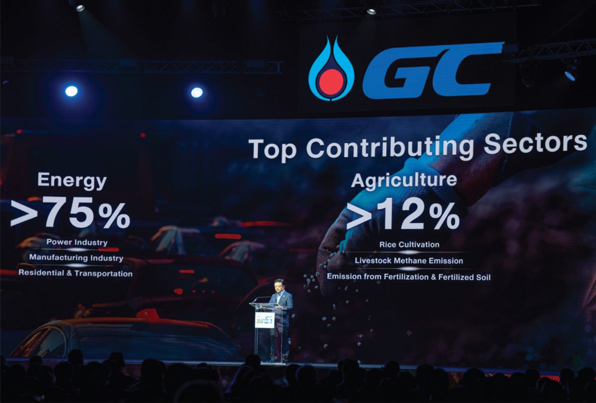 จากนั้น ดร.คงกระพัน อินทรแจ้ง ประธานเจ้าหน้าที่บริหารและกรรมการผู้จัดการใหญ่ (CEO) ของ PTTGC กล่าวว่า ประเทศไทย เป็นประเทศที่ปล่อยก๊าซเรือนกระจกน้อยกว่า 1% เมื่อเทียบกับปริมาณก๊าซเรือนกระจกของทั้งโลก แต่ประเทศไทยกลับเป็น 1 ใน 10 ประเทศของโลกที่ได้จะรับผลกระทบสูงสุด โดยก๊าซเรือนกระจกที่ปล่อยสู่โลกมาจาก 3 อุตสาหกรรมหลักได้แก่ ภาคพลังงาน, ภาคเกษตรกรรรม, ภาคกระบวนการอุตสาหกรรมและการใช้ผลิตภัณฑ์