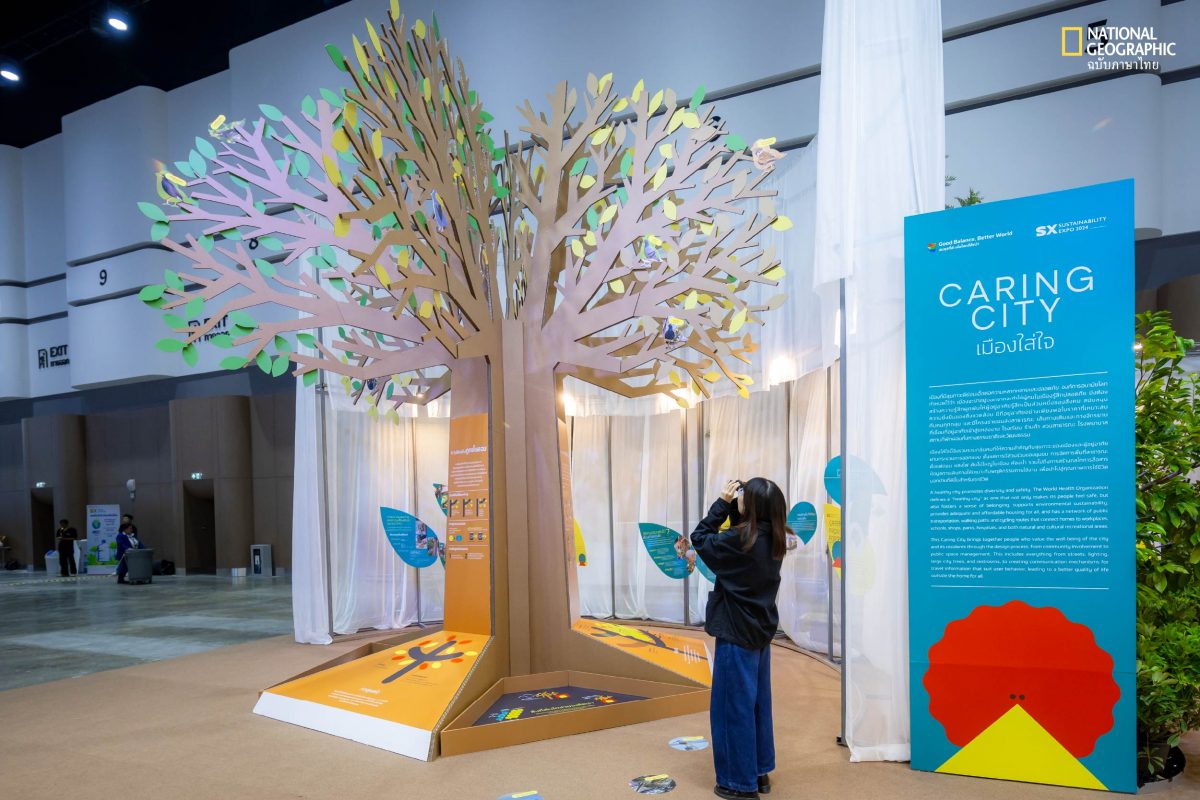 ขยับเข้ามาจากมุม Workshop วาดภาพพืช ผู้เข้าชมนิทรรศการจะถูกดึงดูดสายตาด้วยต้นไม้จำลองขนาดใหญ่ ที่อยู่ในโซน Caring City เมืองที่ใส่ใจ นำเสนอแนวคิดเมืองที่ออกแบบเพื่อให้ทุกชีวิตปลอดภัยและทุกคนสามารถมีคุณภาพชีวิตที่ดีขึ้น โดยต้นไม้ขนาดใหญ่นี้สะท้อนการทำงานของ BIG TREES PROJECT องค์กรอนุรักษ์สิ่งแวดล้อมที่ทำงานเรื่องการสำรวจต้นไม้ในเขตเมืองมาอย่างต่อเนื่อง เราได้เรียนรู้วิธีการดูแลต้นไม้ที่ถูกต้อง หรือจะทำกิจกรรมหยิบกล้องส่องหานก กับสมาคมอนุรักษ์นกและธรรมชาติแห่งประเทศไทย เพื่อเรียนรู้ชนิดของนกที่อยู่ในเมืองร่วมกับมนุษย์ รวมถึงนกป่าที่กำลังถูกคุกคามในปัจจุบัน