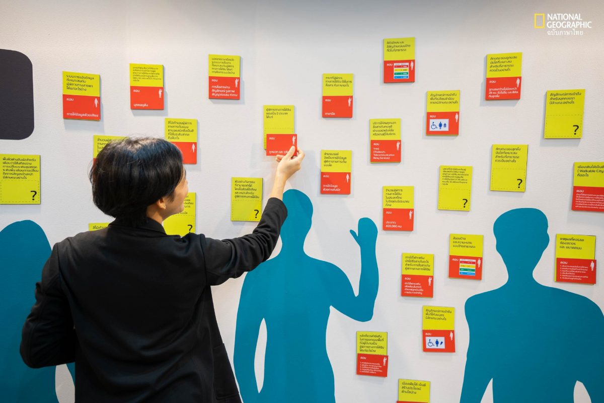 อีกหนึ่งโซนที่น่าสนใจและยิ่งใกล้ตัวเราเข้ามาอีก คือโซน Community Shapes มุ่งเน้นการสร้างสังคมยั่งยืน ผ่านนักลงมือทำที่ใส่ใจชุมชนและสิ่งแวดล้อม กระตุ้นให้เราตระหนักถึงการสร้างเมืองที่เป็นมิตรต่อการใช้ชีวิตสำหรับทุกคน กิจกรรมแรกคือ “เมืองเดินได้ เข็นดี” ภายใต้การทำงานของ ขนส่งมวลชนทุกคนต้องขึ้นได้ Transportation For All ซึ่งบนผนังสีขาวขนาดใหญ่จะเต็มไปด้วยคำถามวัดความรู้เกี่ยวกับการสัญจรของผู้พิการและผู้ใช้วีลแชร์ เช่น ความลาดชันของทางสาธารณะที่เหมาะสมกับผู้ใช้วีลแชร์ ควรมีความชันอยู่ที่กี่องศา ความกว้างขั้นต่ำของทางสัญจรที่รถวีลแชร์ผ่านได้กว้างเท่าไหร่ และผู้เข้าชมนิทรรศการสามารถนำคำตอบในกล่องมาแปะได้ ถือเป็นการเล่นเกมตอบคำถามไปพร้อมกับการเรียนรู้เกี่ยวกับ การสัญจรของผู้ใช้วีลแชร์