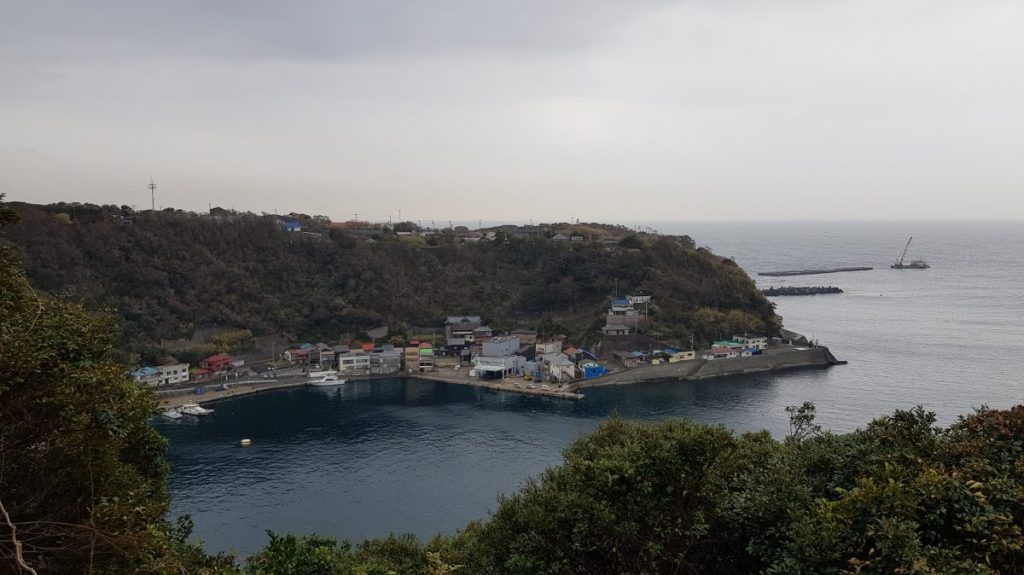 จุดแรกเป็นจุดชมวิวที่มองเห็นท่าเรือเก่าแก่ เรียกว่าจุดชมวิวท่าเรือฮาบุ (Habu) ใกล้กันมีอนุสาวรีย์เฮโรคุ อาคิฮิโระ (Heiroku Akihiro) ซึ่งเป็นผู้นำการเปิดท่าเรือและก่อตั้งหมู่บ้านฮาบุ จากจุดนี้สามารถมองเห็นทิวทัศน์หมู่บ้านที่อยู่เบื้องหน้า ซึ่งเคยเป็นทะเลสาบปากปล่องภูเขาไฟมาก่อน ถัดไปเป็นจุดชมวิวภูเขาที่ตั้งตระหง่านสูงใหญ่ดั่งกำแพง เรียกว่า “ผนังหินอัคนีโอไทเนอุระ” มีทางเดินลาดยางลงไปยังด้านล่าง บริเวณกลางทะเล เราจะเห็น “เกาะฟูเดะ” ซึ่งมีรูปทรงคล้ายปลายพู่กันสูง 30 เมตร บริเวณนี้มีห้องน้ำสาธารณะและศาลาพักผ่อนสำหรับให้ประชาชนทั่วไปสามารถมานั่งปิกนิกได้