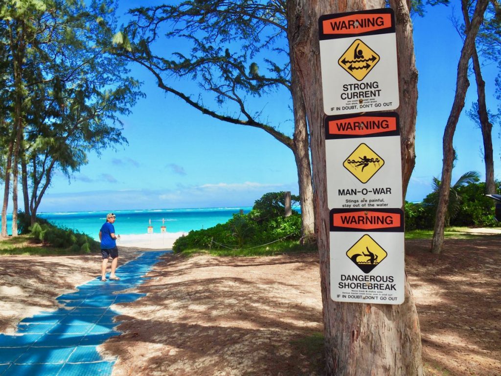 เมื่อมองจากยอดเขา เรามองเห็นผืนน้ำทะเลสีฟ้าเข้มจากข้างบนนั้น สองพ่อลูกจึงขับรถต่อมาอีก 3 นาที จนถึงหาดวายมานาโล (Waimanalo) ซึ่งภาพทะเลที่ปรากฏเบื้องหน้าสวยงามมากจริงๆ แต่มีป้ายเตือนต่างๆ มากมาย ทั้งกระแสน้ำอันตราย คลื่นแรง และ Man-o-war! หมายถึงระวังแมงกะพรุน ผมเองเคยสัมผัสมาแล้ว อาการปวดแสบปวดร้อนเอาเรื่อง และหากผู้ใดมีอาการแพ้อาจถึงแก่ชีวิตได้ วันนั้น ผมเห็นแมงกะพรุนแหวกว่ายกระจายตัวอยู่ในน้ำ คล้ายทุ่นระเบิด แค่มองเห็นก็อดห่วงคนที่ลงเล่นน้ำในละแวกนั้นไม่ได้