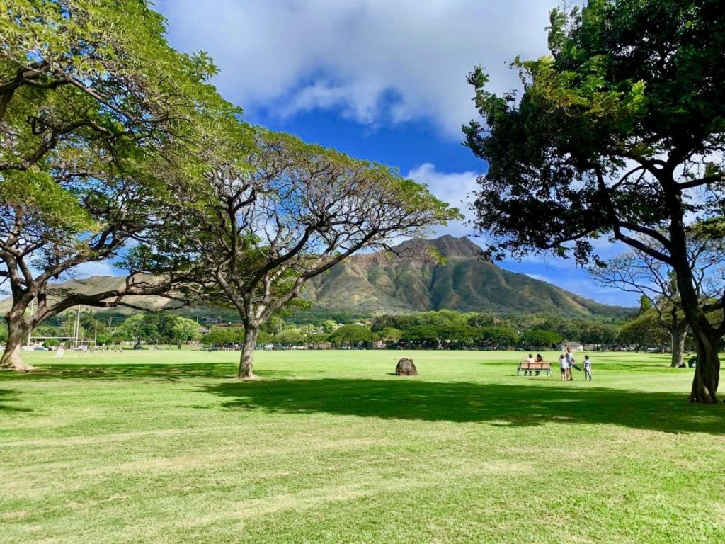 มุมประจำของนักท่องเที่ยวเมื่อมาเยือนโอวาฮู คือ Diamond Head ภูเขาไฟที่เป็นภาพจำอันคุ้นเคยของฮาวาย ภาพนี้ถ่ายจากสวนสาธารณะ Kapiolani ที่มักจะมีงานเฟสติวัลต่างๆ มาจัดแสดงที่นี่ ช่วงที่มีการจัดเทศกาล เต็นท์ของนักท่องเที่ยวถูกตั้งเต็มลาน ต่างจากช่วงเวลาที่ร้างผู้คนเช่นนี้