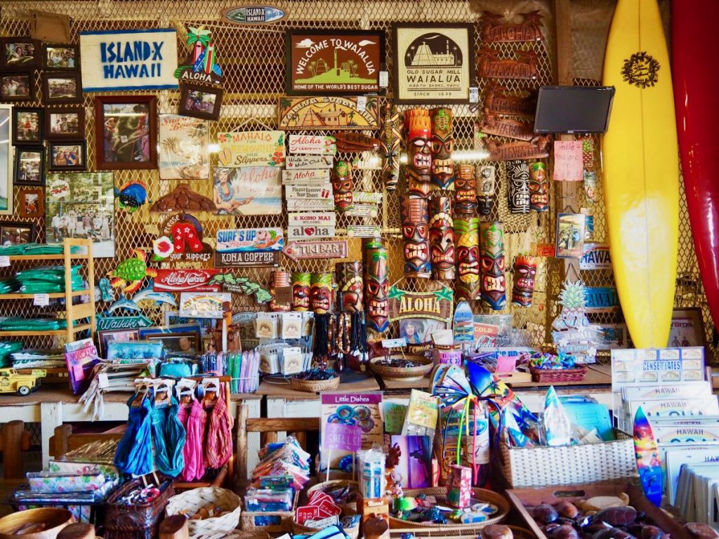 ภาพ 3-4 ก่อนเดินทางกลับที่พัก เราเดินทางผ่านเมืองวายอะลัว (Waialua) เป็นเมืองที่แปลงโฉมโรงน้ำตาลเก่าให้กลายเป็นร้านรวงต่าง ๆ เช่น ร้านทำสบู่ ร้านกาแฟ และร้านขายอุปกรณ์โต้คลื่น ภายในร้านขายของที่ระลึก ทุกอณูเต็มไปด้วยทุกสรรพสิ่งที่แสดงออกถึงความเป็นฮาวาย