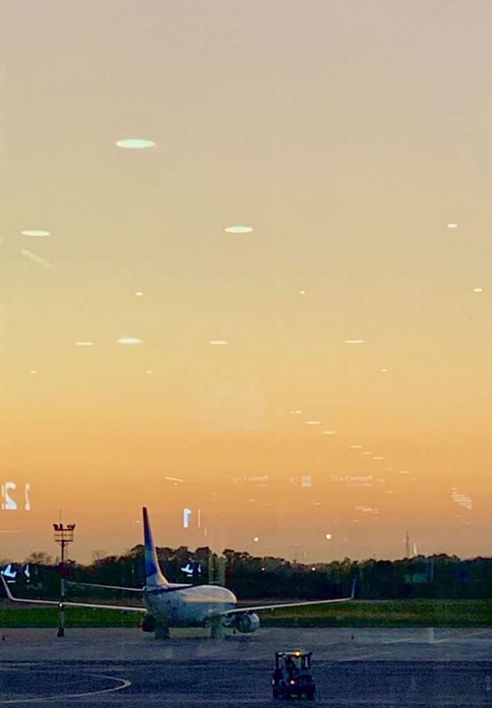 ไม่เกินครึ่งชั่วโมงรถบัสก็มาจอดที่สนามบิน พวกเราเคลื่อนย้ายตัวเองเข้าไปในสนามบินลำบากยิ่งกว่า เพราะจำนวนคนและอากาศที่แสนจะหนาวทำให้ลำบากกว่าเดิม เมื่อจัดการสัมภาระเรียบร้อย เรามานั่งรอในเกตที่ร้างจนไม่เห็นแม้แต่คน หรือร้านค้าที่ไม่แม้แต่จะเปิดบริการ มีเพียงตู้กดน้ำที่ยังคงใช้ได้และเป็นเพียงอย่างเดียวที่สามารถหาของกินได้ น่าขำ!