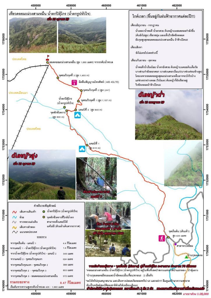 ระหว่างทางขึ้นดอยสามหมื่นจะผ่านจุดรับสัญญาณโทรศัพท์ที่ความสูง 1,247 เมตร โดยระหว่างที่อยู่ในป่าจะไม่มีสัญญาณโทรศัพท์นะครับ ใครอยากโทร.ต้องปีนขึ้นมาบนนี้ ความตั้งใจของทีมที่สองจบลงที่ตรงนี้เพราะคำนวณเวลาและระยะทางแล้วกว่าจะกลับถึงที่พัก ฟ้ามืดแน่นอน เราเลยนั่งรับลมรับฝนกันที่จุดรับสัญญาณโทรศัพท์ อีกอย่างการไปดอยสามหมื่นนั้นต่อให้กายพร้อม ใจพร้อม แต่ธรรมชาติไม่พร้อม ก็อย่าฝืน เพราะตอนนั้นหมอกลงหนักมาก บดบังทัศนียภาพไปหมด เราเลยตัดสินใจลงกัน