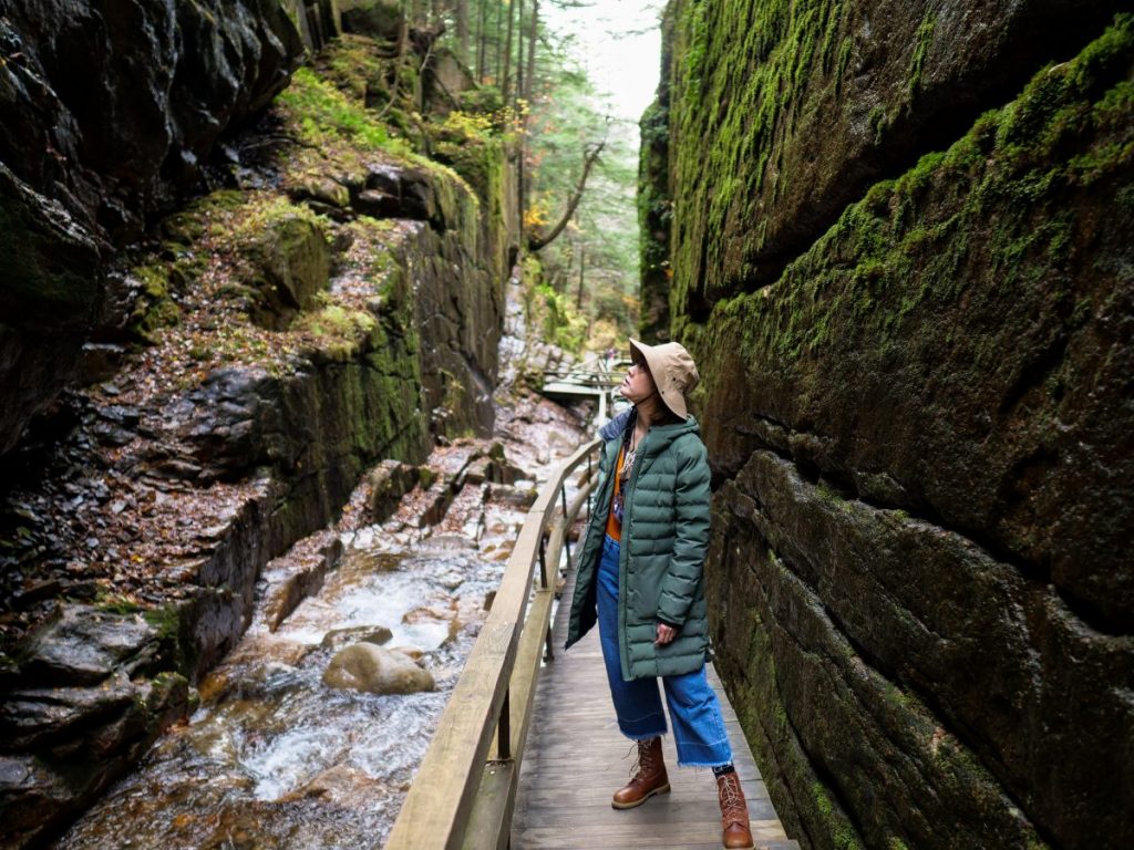 เมื่อสบายใจว่ามีที่จอดรถพักนอนแน่ๆแล้วอีกสองคืนและยังมีเวลาอีกนานในช่วงบ่ายก่อนพระอาทิตย์จะตก เราจึงออกเดินทางไปยังหาที่เที่ยวที่อยู่ไม่ไกล Flume Gorge เป็นสถานที่ท่องเที่ยวที่มีชื่อเสียงในเมือง Lincoln, New Hamshire มีจุดเด่นคือ น้ำตกที่ไหลผ่านช่องแคบระหว่างหน้าผาสูงสองฝั่งลงมายังแม่น้ำด้านล่าง การเข้าชม Flume Gorge ในช่วงนี้จะต้องจองตั๋วล่วงหน้าบนเวบไซต์** เนื่องจากมีการจำกัดปริมาณคนเข้าชมและลดการติดต่อกับพนักงาน