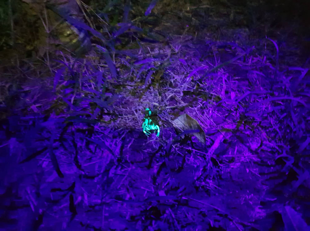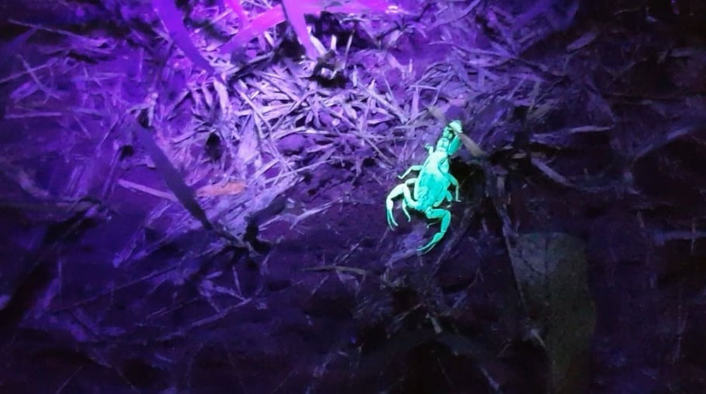 เมื่อดวงอาทิตย์เริ่มจะลับขอบฟ้า ทีมงานก็จัดแจงก่อกองไฟสำหรับกิจกรรมยามค่ำคืน แน่นอนการนั่งดูดาวเป็นหนึ่งในกิจกรรมสำหรับทริปนี้ แต่ที่เราสนุกสุด ๆ คือการนำไฟฉาย UV แสงสีม่วง ไปส่องหาแมงป่อง ซึ่งเป็นสิ่งที่ไม่เคยทราบมาก่อนว่าเปลือกแข็งของมันนั้นจะมีสารเรืองแสง ทำให้เราอดตื่นเต้นไม่ได้ระหว่างเดินตามหาและเฝ้าลุ้นว่าจะได้เห็นเจ้าแมงป่องกันในคืนนี้หรือไม่ แถมในป่ายังมีเห็ดบางชนิดที่มีสารเรืองแสงเช่นนี้ด้วยเหมือนกัน ทั้งเด็กและผู้ใหญ่จึงต่างพากันสนุกไปกับกิจกรรมนี้อย่างมาก ไม่ว่าจะเป็นการได้เห็นความลับของสัตว์ยามค่ำคืน และได้เห็นดวงดาวเต็มท้องฟ้า ก่อนจะปิดท้ายความสนุกของวันเข้าสู่นิทรารมณ์ไปพร้อมความสุข เพราะที่นี่มีกฏว่าสี่ทุ่มทุกคนต้องเข้านอน