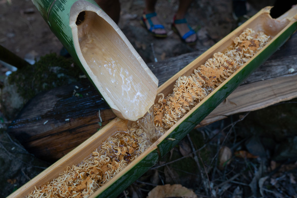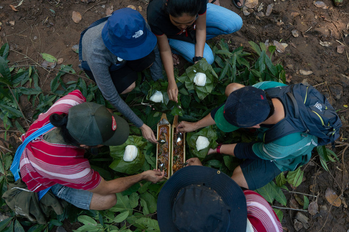 ด้วยการดูแลของควาญช้างและชาวบ้าน ทำให้เรามีมื้อเที่ยงกลางป่าสุดพิเศษ แบบหาในร้านอาหารที่ไหนก็ไม่เจอ เช่น ยำปลากระป๋องในลำไม้ไผ่ตัดสด บะหมี่กึ่งสำเร็จรูปที่ถูกต้มสุกจากน้ำในลำธาร และข้าวที่หุงด้วยกระบอกไม้ไผ่ ช่วยให้อาหารธรรมดา ๆ ชุดนี้ กลายเป็นเมนูสุดประทับใจขึ้นมาทันที
