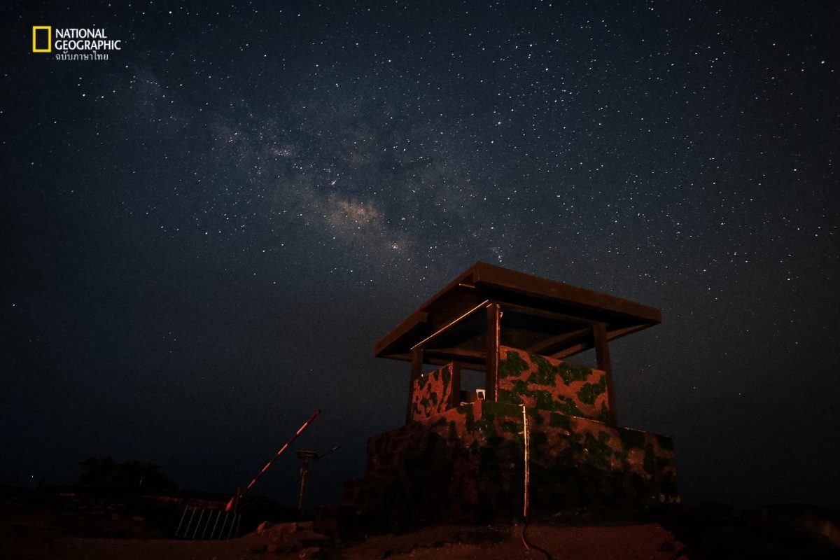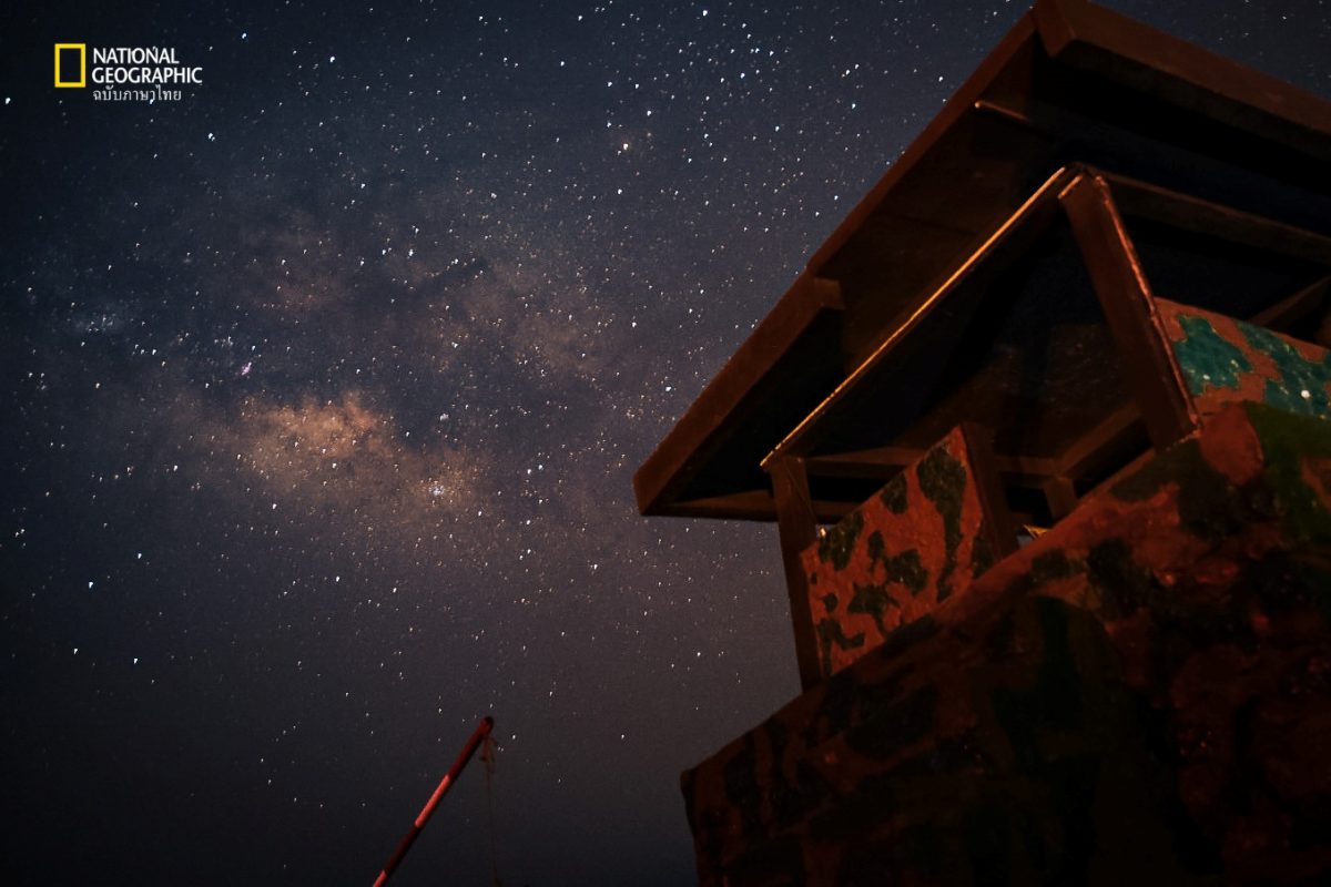 ทางช้างเผือกที่อยู่บนท้องฟ้าในคืนฟ้าเปิด พร้อมกับป้อมสังเกตการณ์ของตำรวจตระเวนชายแดน