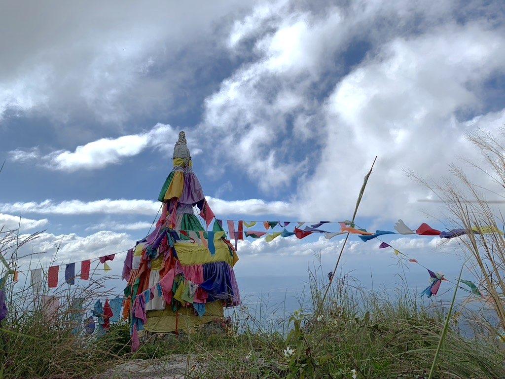 ผมเห็นผ้าหลากสีสันที่ผู้คนนำมาผูกตามองค์สถูป ภาพนี้ดูราวกับอยู่ที่เนปาลที่ใช้ธงสีเป็นสัญลักษณ์ของการอ่อนน้อมต่อธรรมชาติ และให้สายลมโบกธงแผ่ขยายศรัทธาออกไปให้ไกลที่สุด