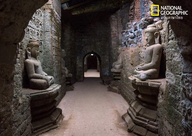ในพื้นที่โบราณสถานแห่งเมืองมเยาะอู้ วัดหินขนาดใหญ่แห่งนี้มีพระพุทธรูปกว่า 90,000 องค์และสถูปกว่า 100 องค์ ทางเดินหินวงกตที่มีการแกะสลักอย่าปราณีตยังงมีสภาพสมบูรณ์ ในขณะที่ส่วนของวัดพังทลายไปเนื่องจากแผ่นดินไหว ภาพถ่ายโดย ERIC LAFFORGUE/ART IN ALL OF US, GETTY IMAGES
