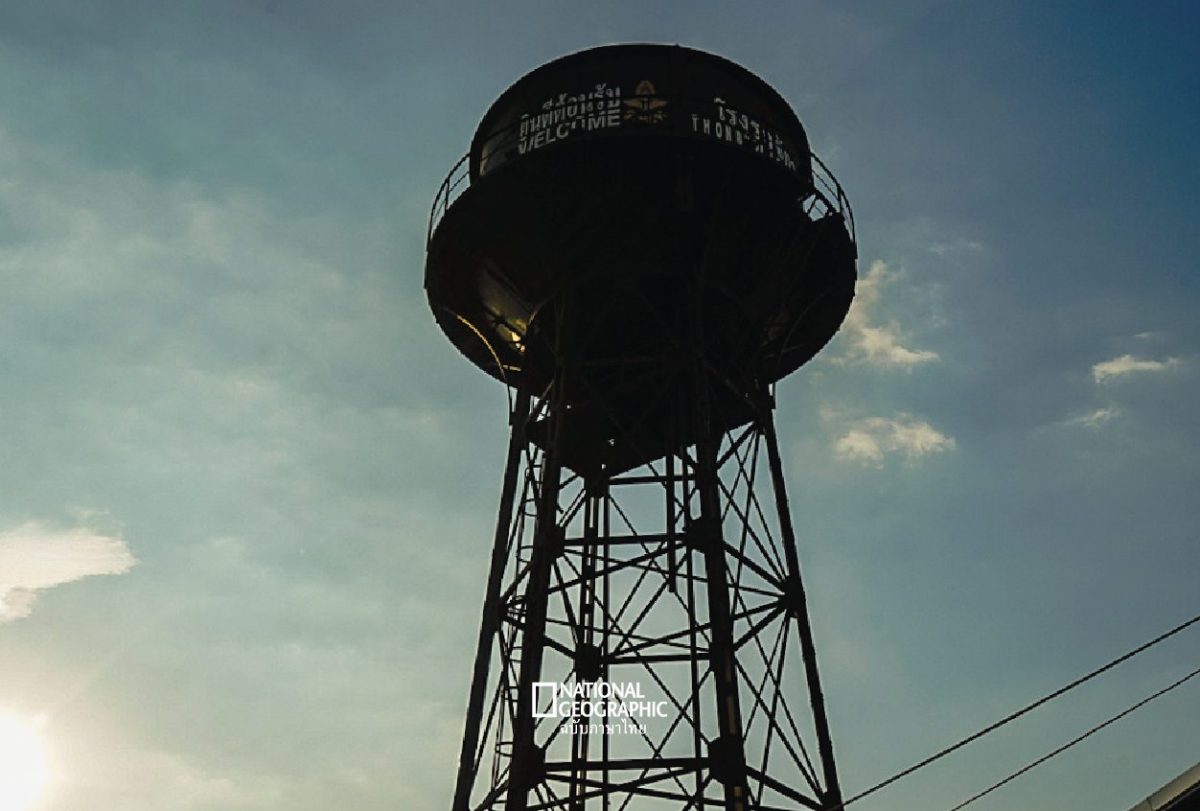 แท็งค์เก็บน้ำร้อนที่โรงรถจักรธนบุรี เห็นตระหง่านแต่ไกล สะดุดตาด้วยทาสีดำต่างจากแท็งค์ทั่วไป ภาพโดย ประภัสสร ตัณฑโอภาส