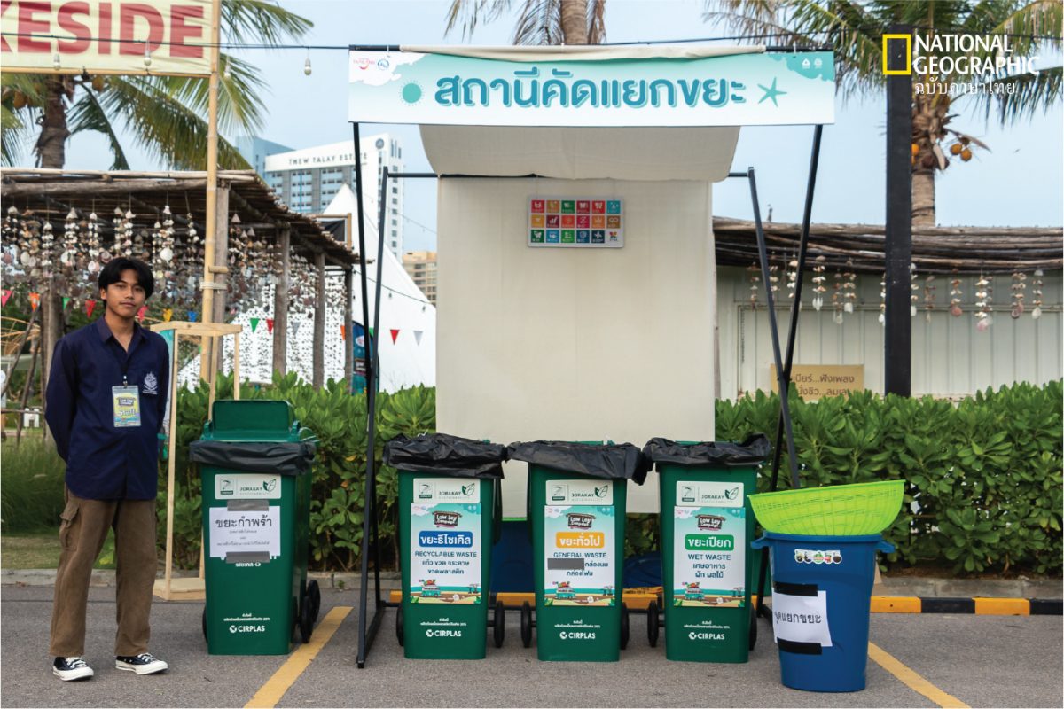 สิ่งสำคัญภายในงานคือ สถานีคัดแยกขยะ 3 จุด ตรงทางเข้างาน และจุดที่ใกล้กับร้านค้า โดยแยกเป็นขยะรีไซเคิล ขยะทั่วไป และขยะอาหาร ซึ่งมีนักศึกษาจากมหาวิทยาลัยศิลปากรมาเป็นอาสาสมัครประจำจุดแนะนำการแยกขยะอย่างถูกวิธี