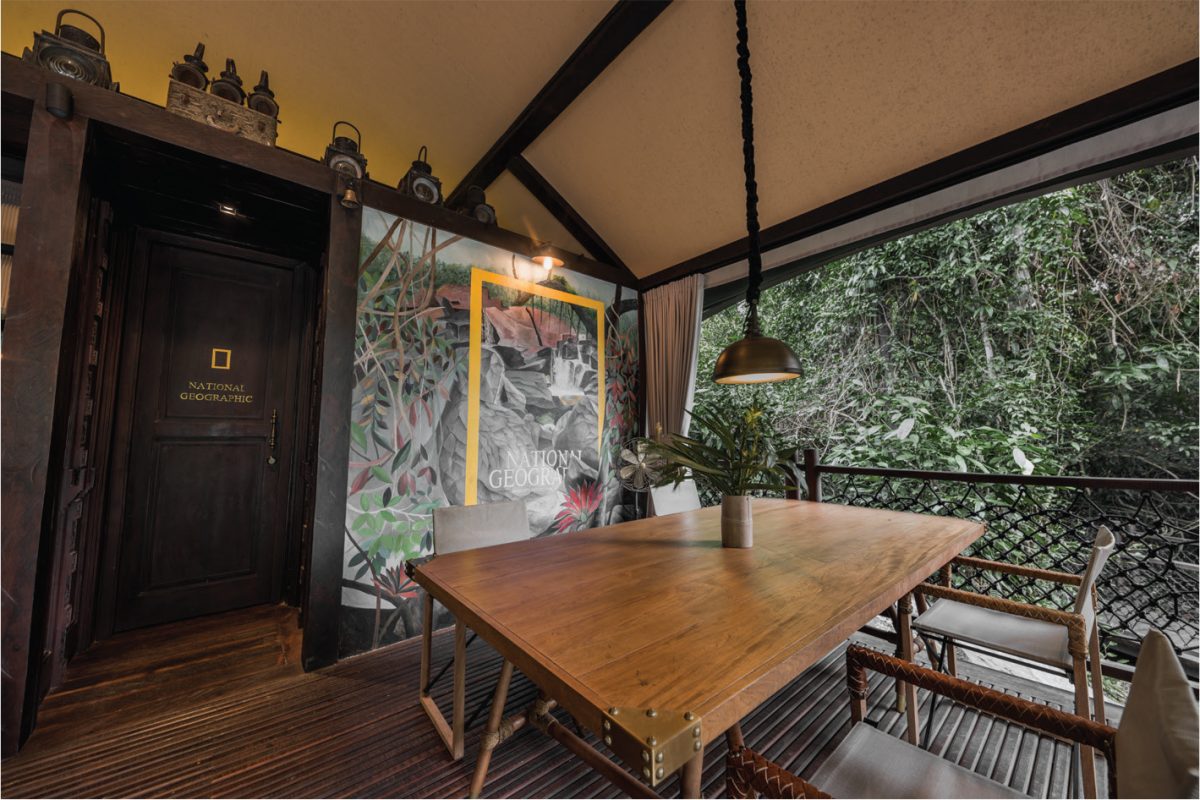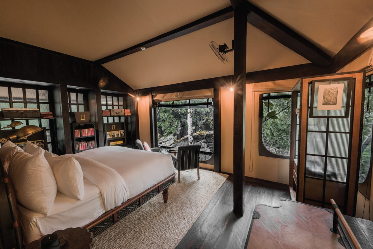 ออกแบบให้เป็นแคมป์เต็นท์สุดหรูใจกลางป่า 15 เต็นท์ ซึ่งมีโครงสร้างและองค์ประกอบหลักเหมือนกัน แต่ตกแต่งด้วยแนวคิดซึ่งได้แรงบันดาลใจจากความหลงใหลและความทรงจำอันน่าประทับใจของเบนสเลย์ที่แตกต่างหลากหลาย ตั้งแต่เต็นท์ที่ได้แรงบันดาลใจจาก แจคเกอลีน เคเนดี้, เต็นท์ชะนี สัตว์ที่ค้นพบได้มากในผืนป่าแห่งนี้ รวมถึงเต็นท์ National Geographic นิตยสารในดวงใจที่จุดประกายความเป็นนักสำรวจผู้รักธรรมชาติให้แก่เขามาตั้งแต่เด็ก