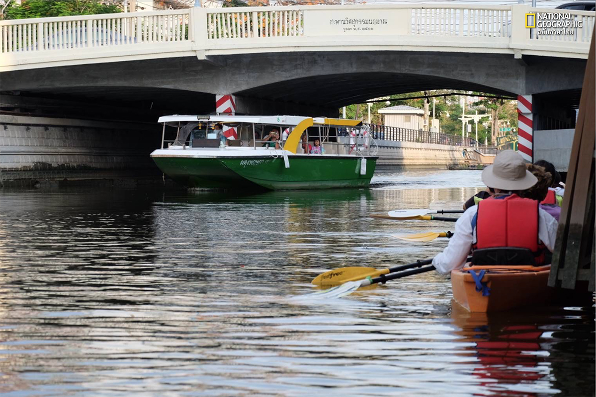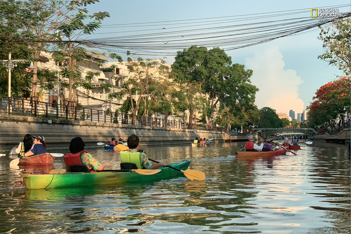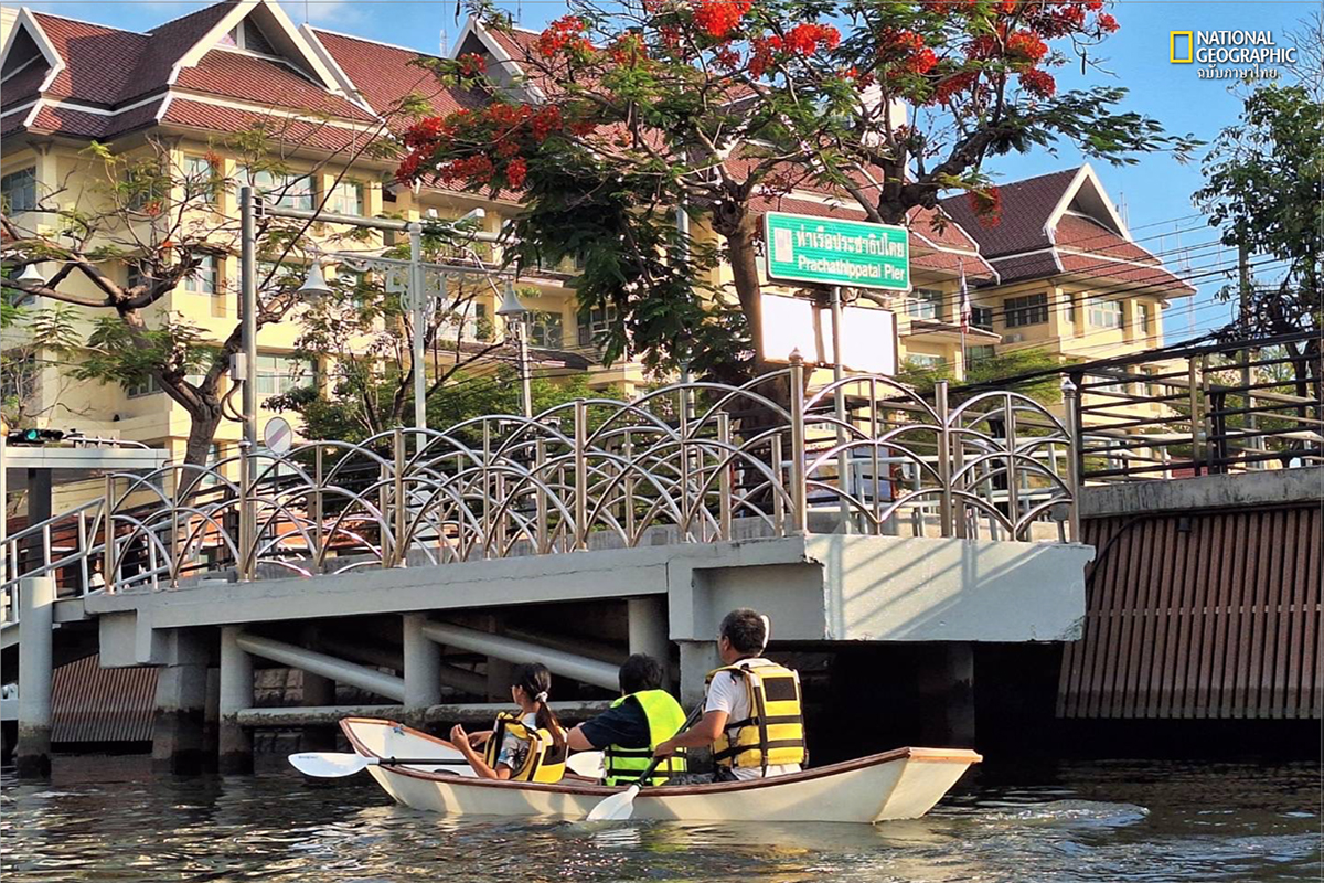 เส้นทางยาว 5.5 กิโลเมตร จากท่าตลาดเทวราชถึงหัวลำโพงกับ Kayak Half Day Trip กิจกรรมไฮไลต์ของ ‘เทศกาลวิถีน้ำ วิถีไทย’ Water Festival 2025 ซึ่งจัดขึ้นโดยบริษัทไทยเบฟเวอเรจ จำกัด (มหาชน) ที่ได้คุณปิติ เสรเมธากุล จากอุทยานการเรียนรู้ป๋วย 100 ปี มาเป็นผู้ออกแบบกิจกรรมและพานักพายเมือเก่า-ใหม่ กว่า 30 คน ออกเดินทางด้วยเรือที่ประดิษฐ์ขึ้นจากขยะเหลือใช้