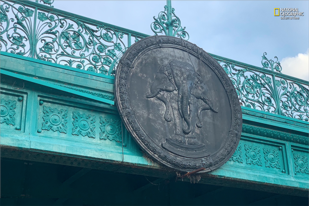 พอพวกเราพายมาถึงสะพานมัฆวานรังสรรค์ คุณปิติก็ชี้ให้เราดูลักษณะของสภาปัตกรรมที่ทำให้สะพานนี้โดดเด่นกว่าสะพานใด ๆ ในกรุงเทพฯ นั่นก็คือ เสาหินอ่อนสี่มุมสะพานที่รองรับโคมไฟสำริด และผนังเชิงลาดของสะพานที่ประดับด้วยหินอ่อนที่มาจากอิตาลี แต่สิ่งที่สะดุดตาเรามากที่สุดกลับเป็นตราสัญลักษณ์รูปช้างเอราวัณที่กลางสะพาน สัญลักษณ์ของกรุงเทพมหานคร ซึ่งสามารถมองเห็นได้ชัดที่สุด เมื่อเดินทางด้วยเรือมายังจุดนี้เท่านั้น