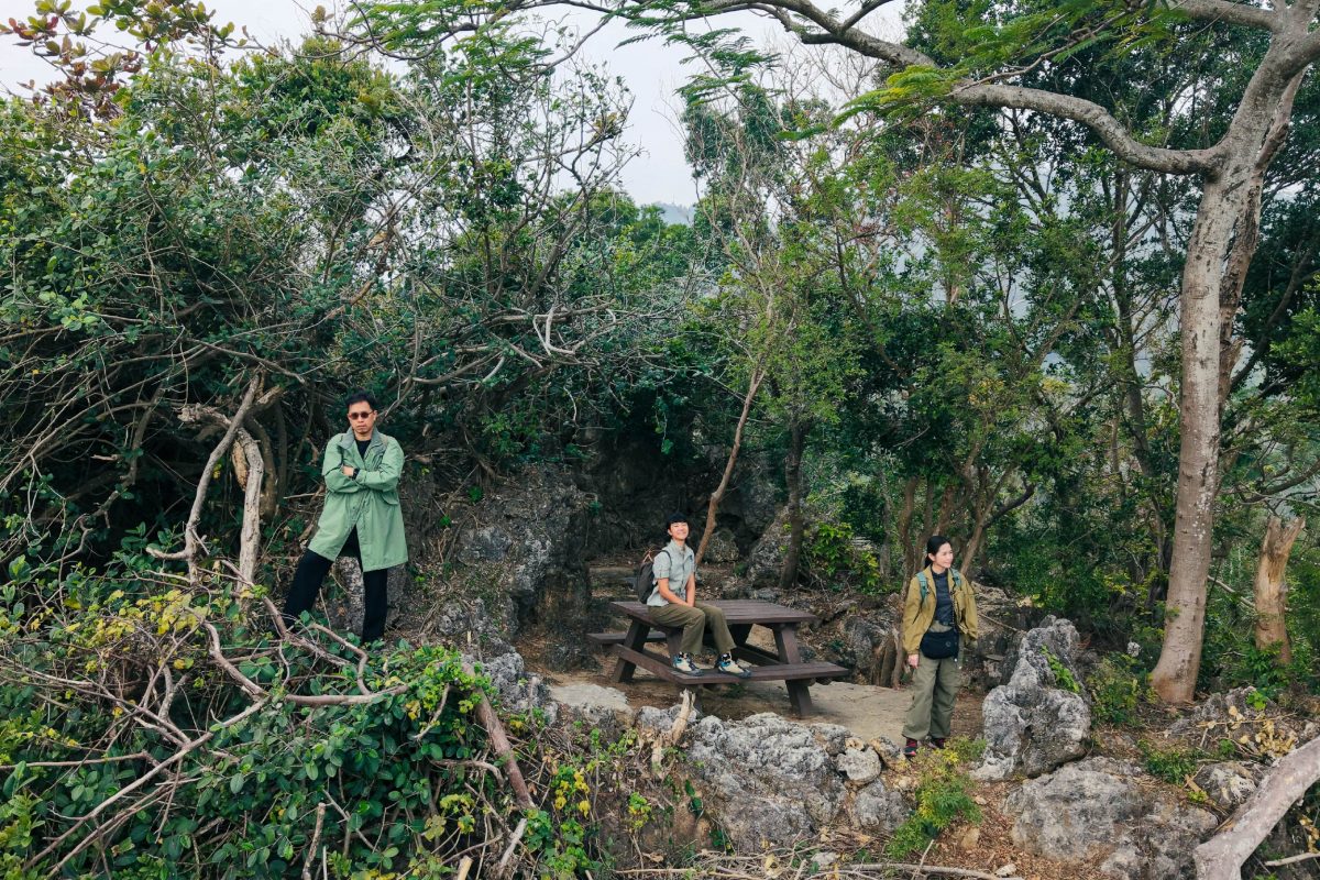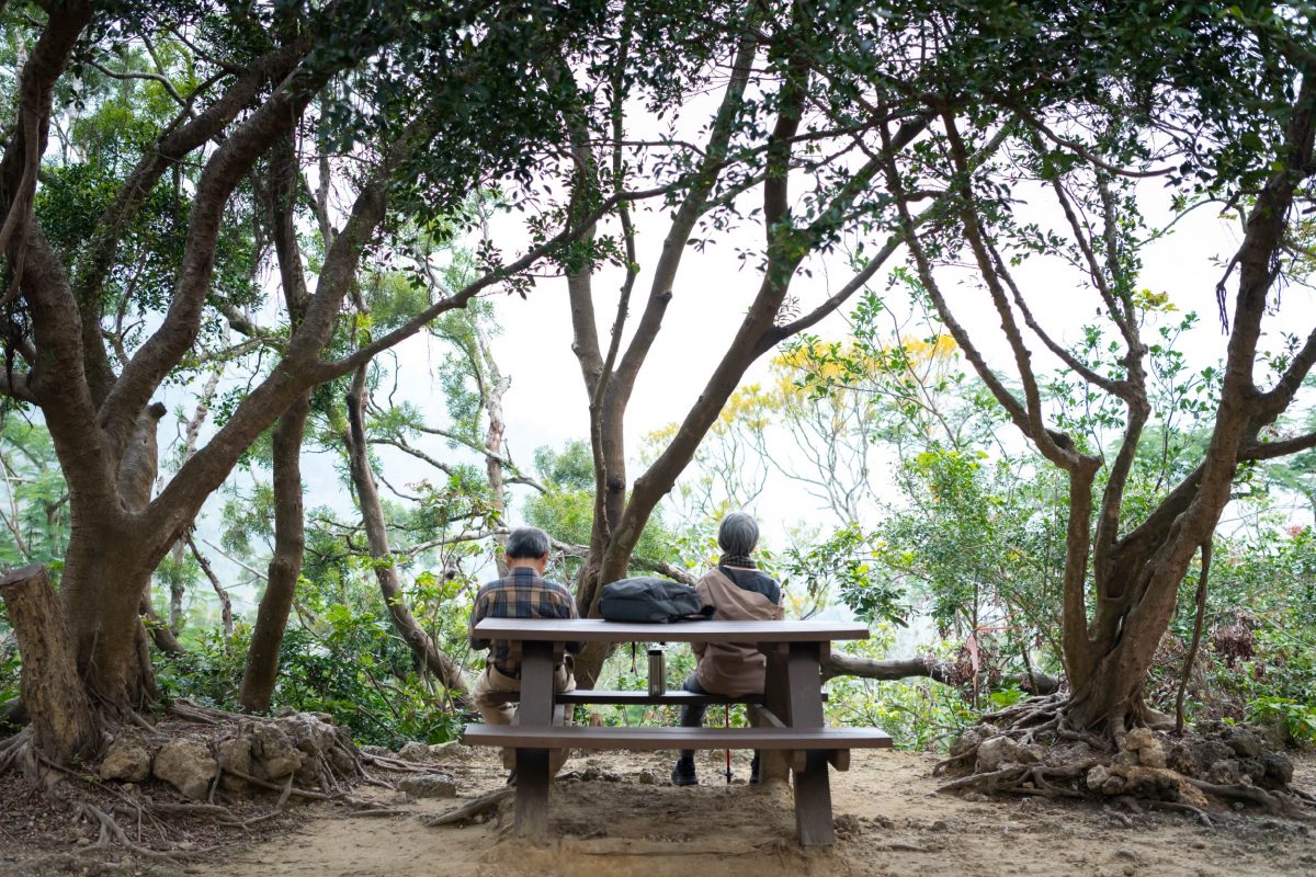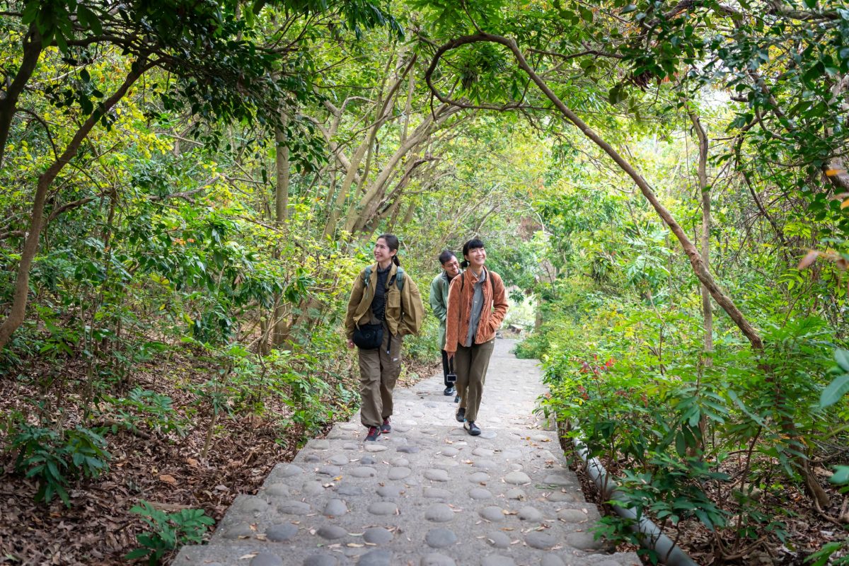 หากจะเดินไปถึงยอดเขาที่จะเห็นวิวท่าเรือเกาสง ต้องเดินเป็นระยะทางยาว 6 กิโลเมตร พวกเราหลายคนขอออมแรงเอาไว้ไปเที่ยวต่อ จึงเลือกเดินในเส้นทางสู่ป้อมหลงเหมินและป้อมกวนหลิน ระยะทางไป (ไม่รวมกลับ) เพียง 1 กิโลเมตรนิด ๆ เส้นทางเริ่มต้นด้วยทางคอนกรีตไปสู่ทางธรรมชาติ ระหว่างชมนกชมไม้ ก็ไม่ลืมสังเกตลักษณะหินที่มีรูพรุนตามคุณสมบัติทางธรณีวิทยาของปะการังที่ดันตัวขึ้นเป็นภูเขา เราสามารถพบหินเขาแบบนี้ได้อีกหลายแห่งในไต้หวัน