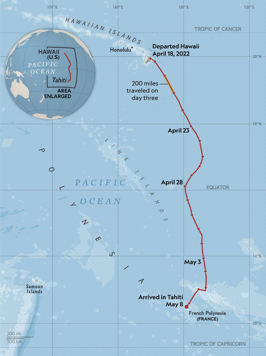 “เราจะประเมินว่าเราอยู่ห่างจากเกาะแค่ไหน” เธอเล่า “และเราจะตั้งค่าเส้นทางเพื่อมุ่งหน้าไปทางตะวันออกเฉียงใต้” จากนั้นไม่นานเธอต้องวางสายและยังไร้เสียงโทรกลับ Hōkūle’a และลูกเรือ 10 คนมุ่งหน้าไปยังตาฮิติ ด้วยระยะทาง 3,000 ไมล์กับเวลาอีก 20 วัน