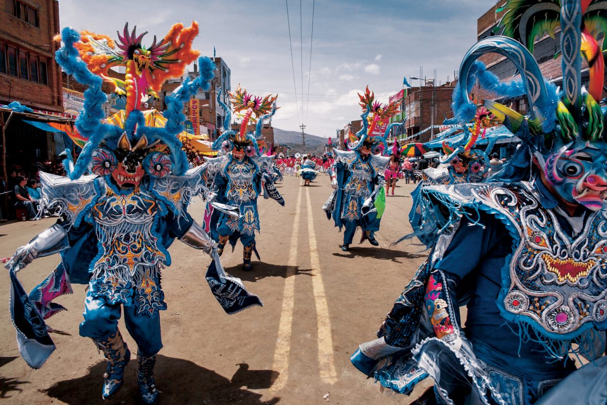 นักแสดงสวมหน้ากากเดินพาเหรดผ่านถนนในเมืองปูโนระหว่างเทศกาลเดียบลาดา (งานเต้นรำของปีศาจ) ประจำปี ซึ่งเป็นส่วนหนึ่งของงานเฟียสตาเดลากันเดลาเรียที่มีมานานหลายศตวรรษ พิธีกรรมที่ผสมผสานความเชื่อของผู้คนในแถบเทือกเขาแอนดีสนี้เป็นสัญลักษณ์ของการต่อสู้ระหว่างธรรมะกับอธรรม