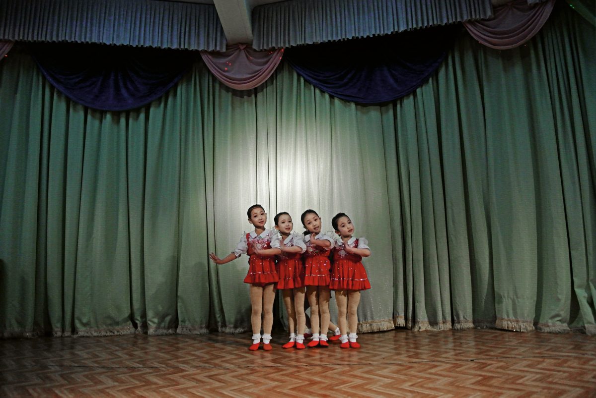 เด็กนักเรียนวัยเยาว์ในเมืองเซนวีจูเต้นรำให้กลุ่มนักท่องเที่ยวชาวจีนชมเป็นประจำ เมืองชายแดนซึ่งมีแม่น้ำยาลู่คั่นจากเมืองต้านตงของจีนนี้เปิดรับนักท่องเที่ยวจากประเทศเพื่อนบ้านมานานแล้ว และเริ่มต้อนรับนักท่องเที่ยวชาวตะวันตกบางส่วนเมื่อปี 2013