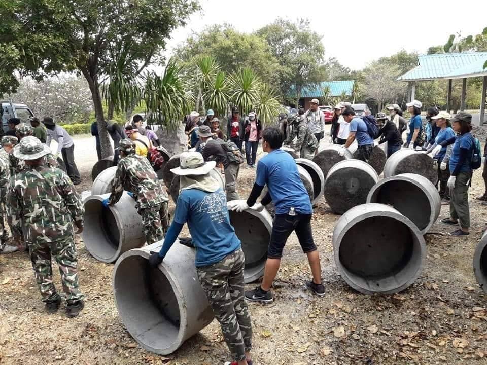 เมื่อล้อมรั้วทำถนนแล้ว ก็มีเสียงวิพากษ์วิจารณ์ว่า ด้านบนภูเขาจะมีแหล่งน้ำและอาหารเพียงพอสำหรับสัตว์ป่าหรือไม่ ทางทีมเราจึงเริ่มการสร้างฝายชะลอน้ำ แต่เนื่องด้วยสภาพของเขาหินปูนไม่สามารถกักเก็บน้ำได้ดี จึงคิดหาวิธีแก้ปัญหาโดยการนำวงท่อซีเมนต์ที่หาได้ทั่วไป นำมาเป็นแหล่งกักเก็บน้ำสำหรับเลียงผาในช่วงฤดูแล้ง น้าหมูและทีมงานช่วยกันขนส่งท่อและติดตั้งตามจุดต่างๆ บนเขาสมโภชน์ และเมื่อเข้าสู่ฤดูแล้ง น้าหมูก็เชิญชวนอาสาสมัครลำเลียงน้ำไปเติมในวงท่อซีเมนต์ที่ติดตั้งไว้