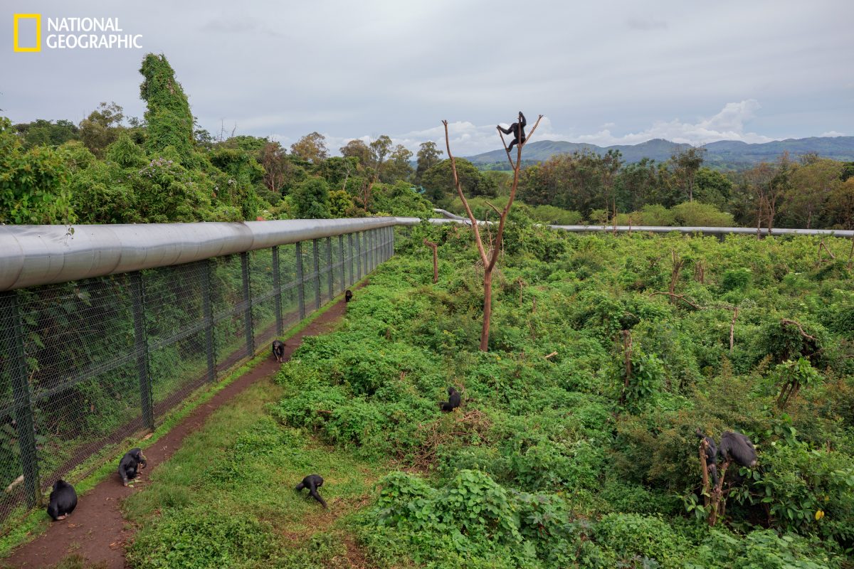 ณ ศูนย์ฟื้นฟูสัตว์ป่าแห่งหนึ่งในแอฟริกากลาง ชิมแปนซี ที่จิตใจบอบช้ำเป็นแบบอย่างของการฟื้นตัวให้ผู้ช่วยชีวิตพวกมัน