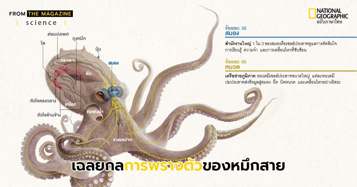 โอลิเวีย จัดสัน เขียนในสารคดี “นักมายากลแปดหนวด” ใน National Geographic ถึงหมึกสายหรือหมึกยักษ์ ที่เปลี่ยนรูปร่างและสีสันได้ตามต้องการ พ่นหมึก แทรกตัวหายไปในรอยแยกเล็กๆ และลิ้มรสด้วยปุ่มดูด แล้วเหตุใดมันจึงชวนให้เรานึกถึงตัวเราเอง