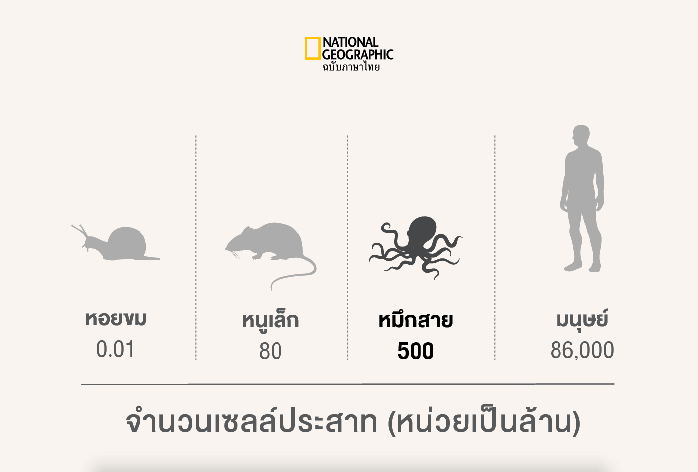หมึกสายและเครือญาติมีจำนวนเซลล์ประสาทมากกว่าสัตว์ไม่มีกระดูกสันหลังอื่นๆ อย่างมาก และทำให้สัตว์ฟันแทะ กบ และสัตว์มีกระดูกสันหลังอื่นๆ อีกมากมายต้องอับอาย