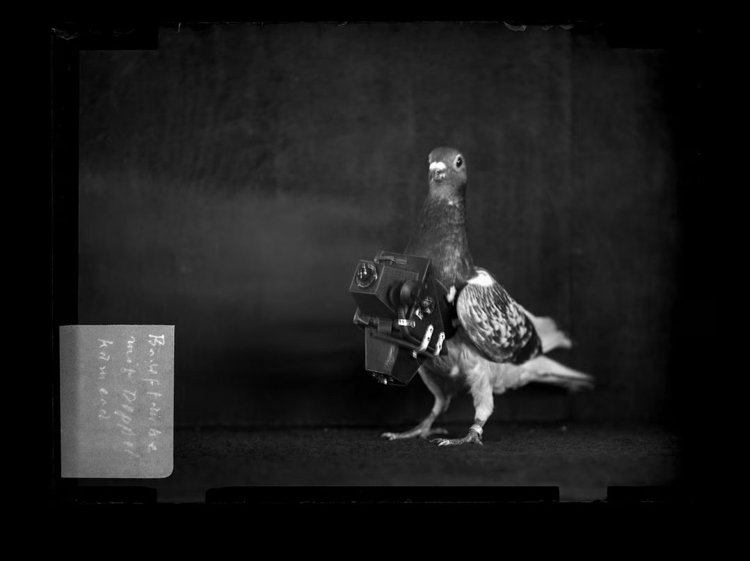 กล้องติดนกพิราบตัวแรกถูกสร้างขึ้นใน ค.ศ. 1907 โดยนักประดิษฐ์ชาวเยอรมันที่ชื่อว่า ยูลีอุส น็อยบรอนเนอร์ (Julius Neubronner) กล้องขนาดเล็กชิ้นนี้ประกอบไปด้วย สายรัดอะลูมิเนียมที่มีน้ำหนักเบา และกล้องถ่ายภาพแบบหน่วงเวลา ภาพถ่ายโดย RORHOF/ STADTARCHIV KRONBERG