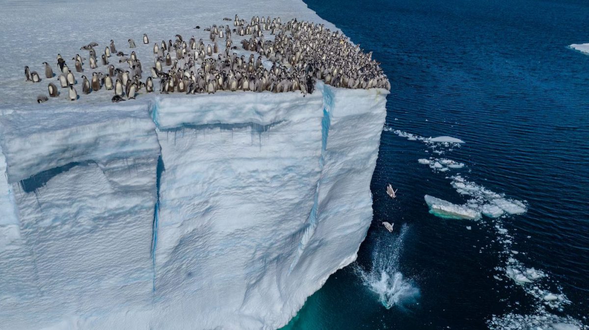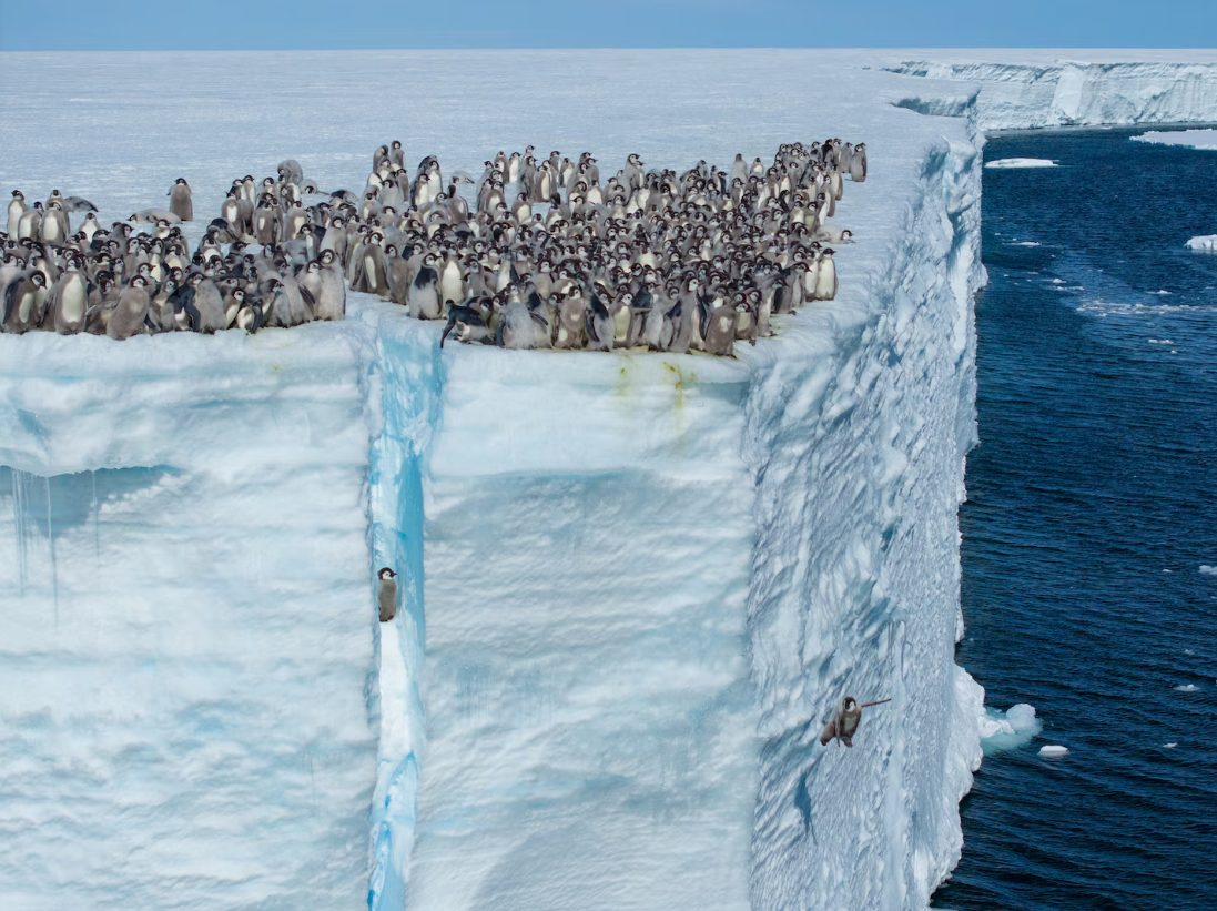 ลูกนกเพนกวินจักรพรรดิหลายร้อยตัวยืนรวมกันอยู่บนยอดหิ้งน้ำแข็งแอนตาร์กติกา ซึ่งสูงประมาณ 15 เมตรเหนือท้องทะเล เหมือนกับกลุ่มวัยรุ่นที่ยืนรวมกันอยู่บนยอดผา เพื่อรอดูว่าใครคือผู้กล้าคนแรกที่จะกระโดดลงไปในผืนทะเลด้านล่างเป็นคนแรก
