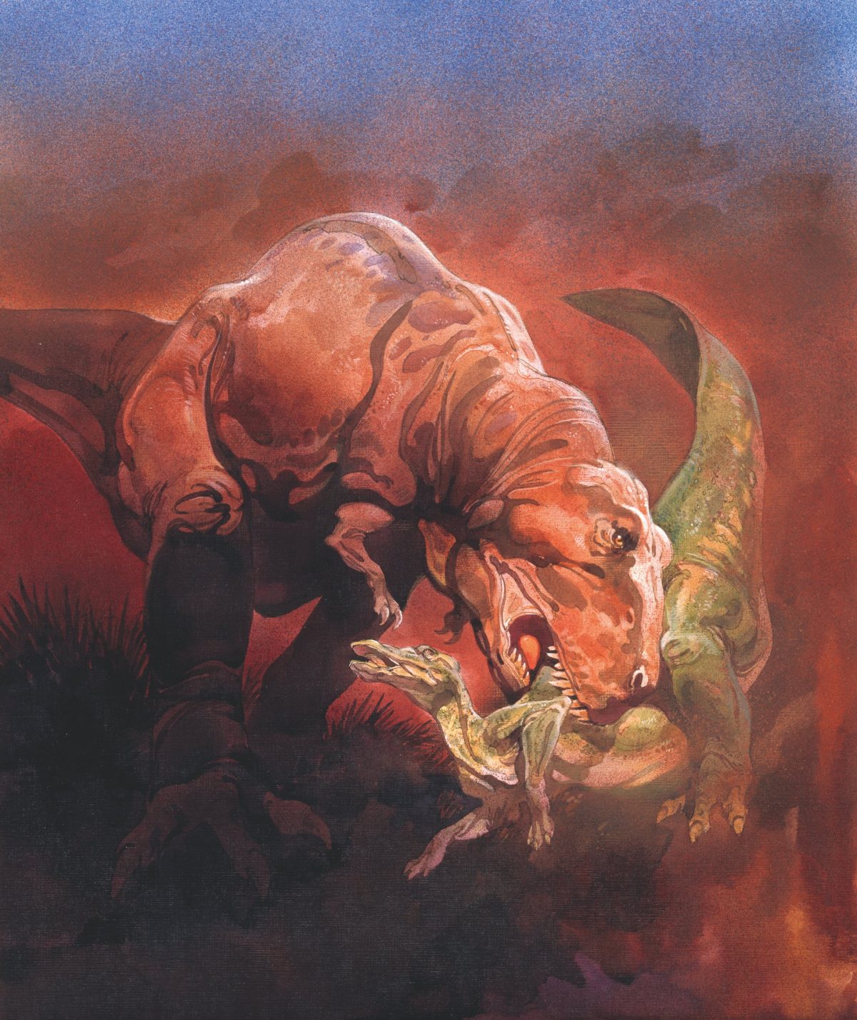 นับจากปี 1919 สารคดีเรื่องหนึ่งในนิตยสารได้วางรากฐานไว้ โดยบรรยายถึง อัลเบอร์โตซอรัส ว่าเป็น “สัตว์กินเนื้อทรงพลัง” ซึ่ง “สามารถทำลายเครือญาติที่กินพืชของมันชนิดใด ๆ ก็ได้” ยี่สิบสามปีต่อมา คู่ต่อสู้อย่าง ที. เร็กซ์ ก็ปรากฏโฉมในหน้านิตยสารของเราด้วย “ความสูงหกเมตร” สามทศวรรษครึ่งหลังจากนั้น สารคดีจากปกเรื่องหนึ่งใน ปี 1978 รายงานว่า ที. เร็กซ์ ถึงกับมีขนาดใหญ่กว่านั้นเป็น “ข่าวร้ายสูงสิบห้าเมตรและหนักหกตัน”