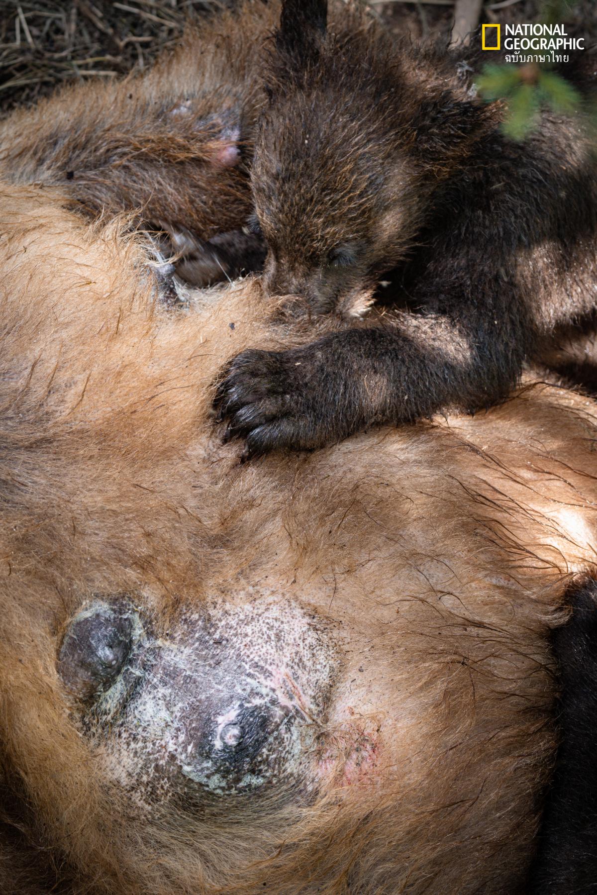 A mother bear nurses her cub under a tree to ensure her cub is fed enough to survive the winter months.