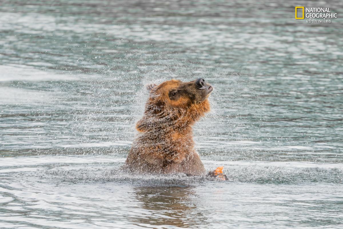 Like a wet dog, the brown bear shakes off river water to dry its fur before consuming the salmon it catched a few moments ago.