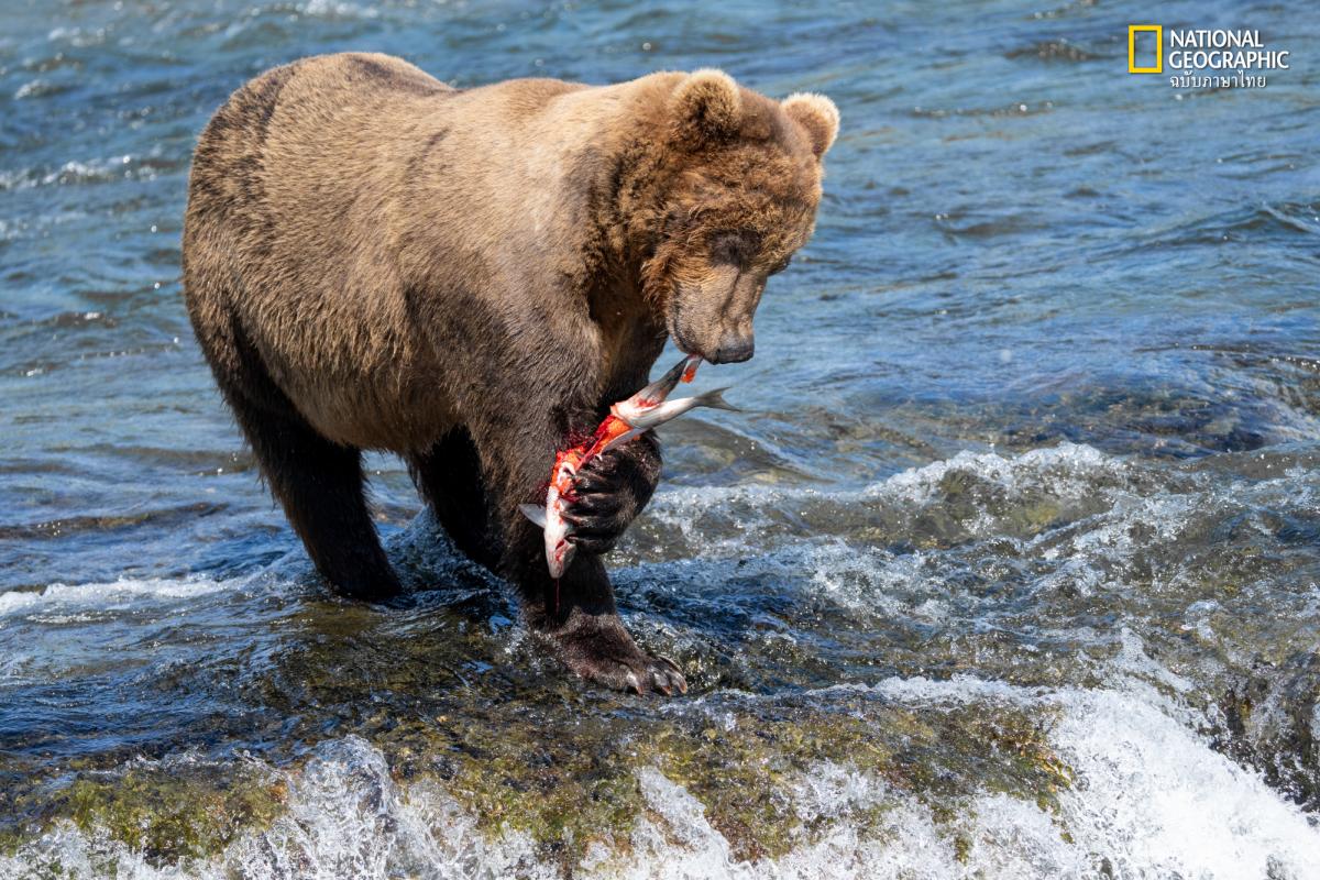 The salmon’s skin is ripped off like a banana peel as the bear’s powerful jaw dissects the salmon to consume only nutrient rich organs.