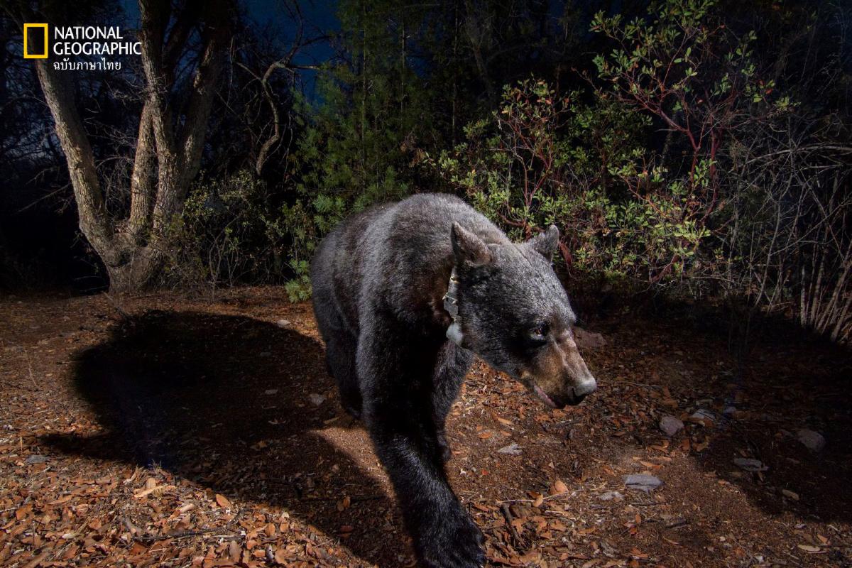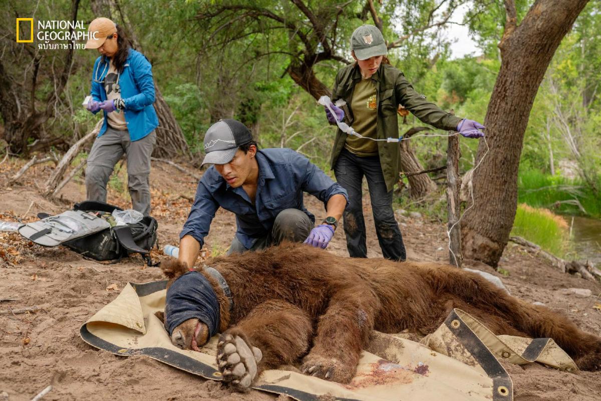 กาเนช มาริน นักนิเวศวิทยาสัตว์ป่าและนักสำรวจเนชั่นแนล จีโอกราฟฟิก สวมปลอกคอจีพีเอสให้หมีดำที่ถูกยิงยาสลบ โดยมีสัตวแพทย์ ซูแซนา เยสกัส (ทางซ้าย) และผู้ชำนาญการสัตว์ป่า เพจ แซตเทอร์ฟีลด์ คอยช่วยอยู่ข้าง ๆ โครงการติดตามสัตว์ป่าของมารินแสดงให้เห็นว่า หมีมีปฏิสัมพันธ์อย่างไรกับถนน รั้ว และกำแพงชายแดน